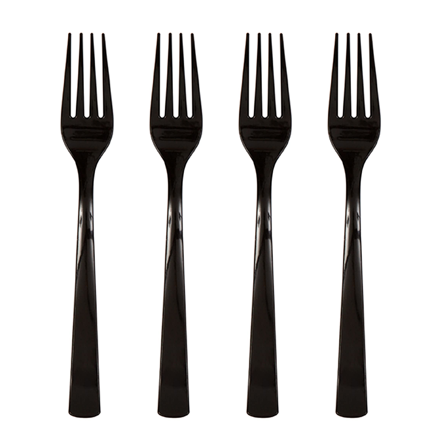 Serve meals with sleek sophistication using these Black Solid Plastic Forks (18 ct). Molded from food-safe, BPA-free polystyrene, each fork features four sturdy tines and an ergonomic handle designed for comfortable grip and reliable performance. The matte black finish adds a modern, versatile accent to any table setting—from elegant weddings and corporate events to casual backyard barbecues. Lightweight yet durable, these disposable forks hold up through multiple courses without bending, then tuck neatly into your recycling bin for quick cleanup. Disposable Cutlery