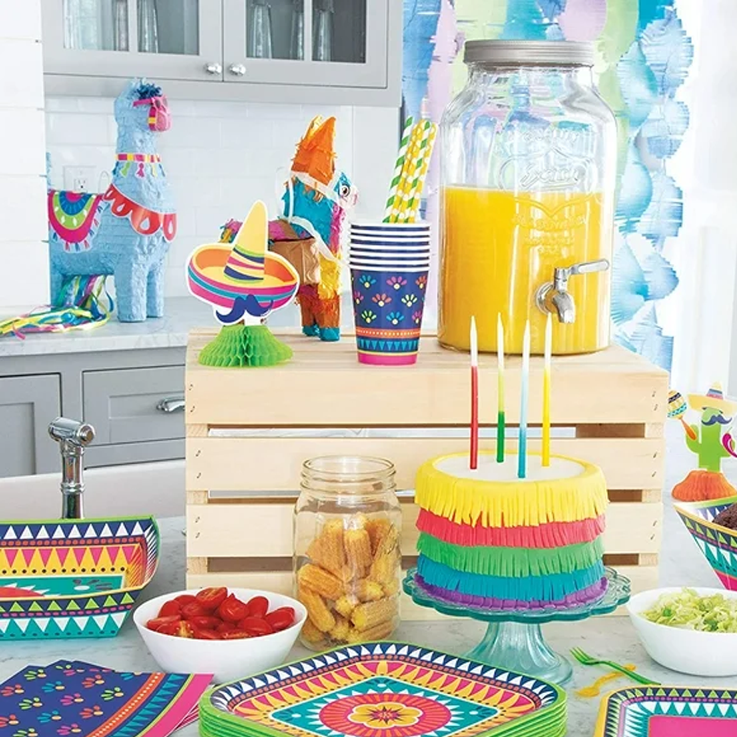 Coordinated Décor: Matches Boho Fiesta napkins, plates, and table covers