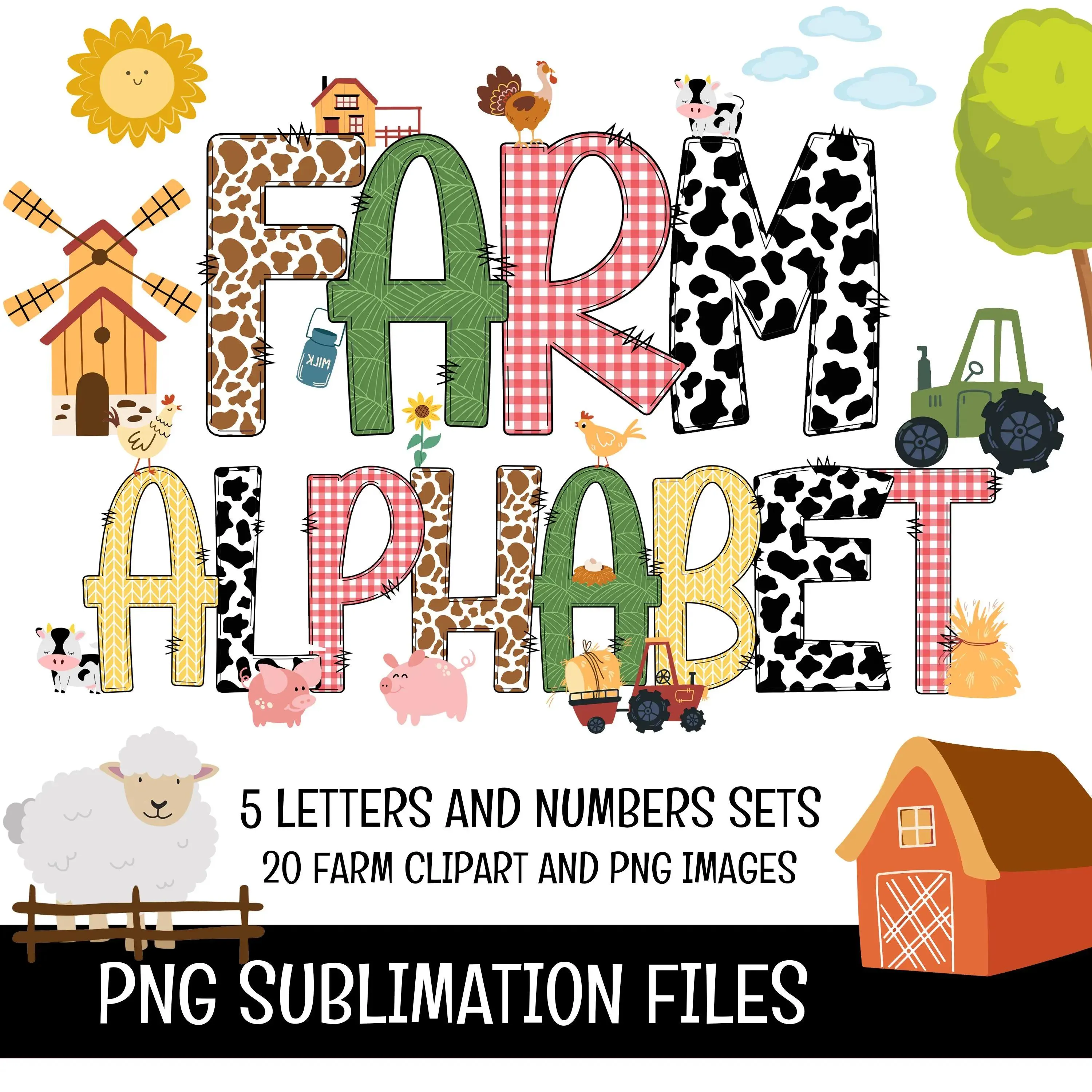Farm Animals Doodle Alphabet Letters, Numbers PNG Bundle Instant Download