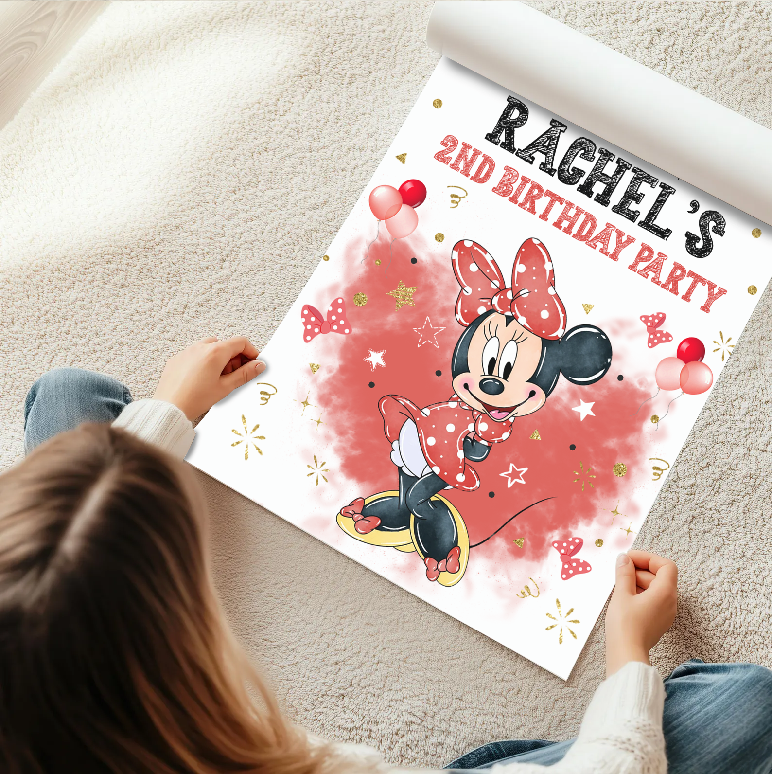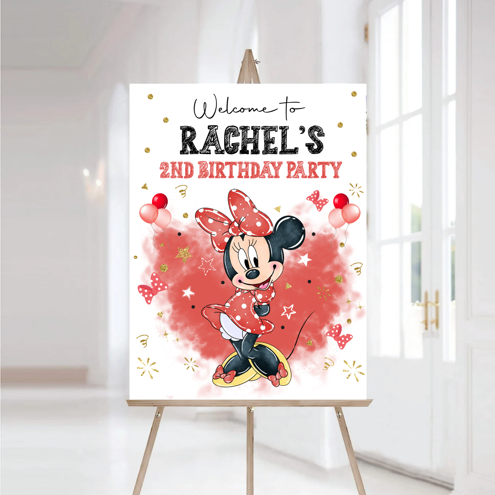 Welcome guests to your magical celebration with this Minnie Mouse Red Welcome Sign! Featuring Minnie in her classic red bow and polka dots, this charming sign is the perfect entrance decoration for birthdays, baby showers, and Disney-themed parties.