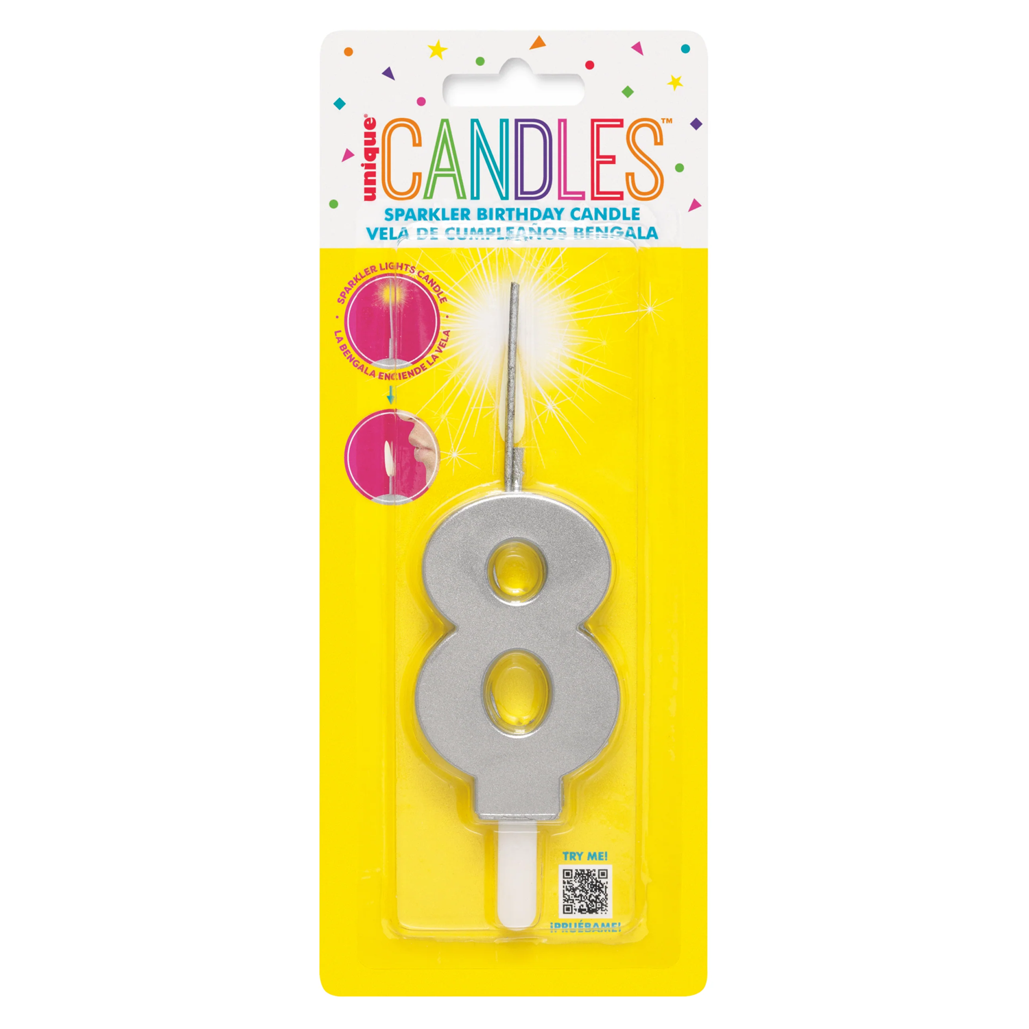 Silver Number 8 Sparkler-Topped Birthday Candle