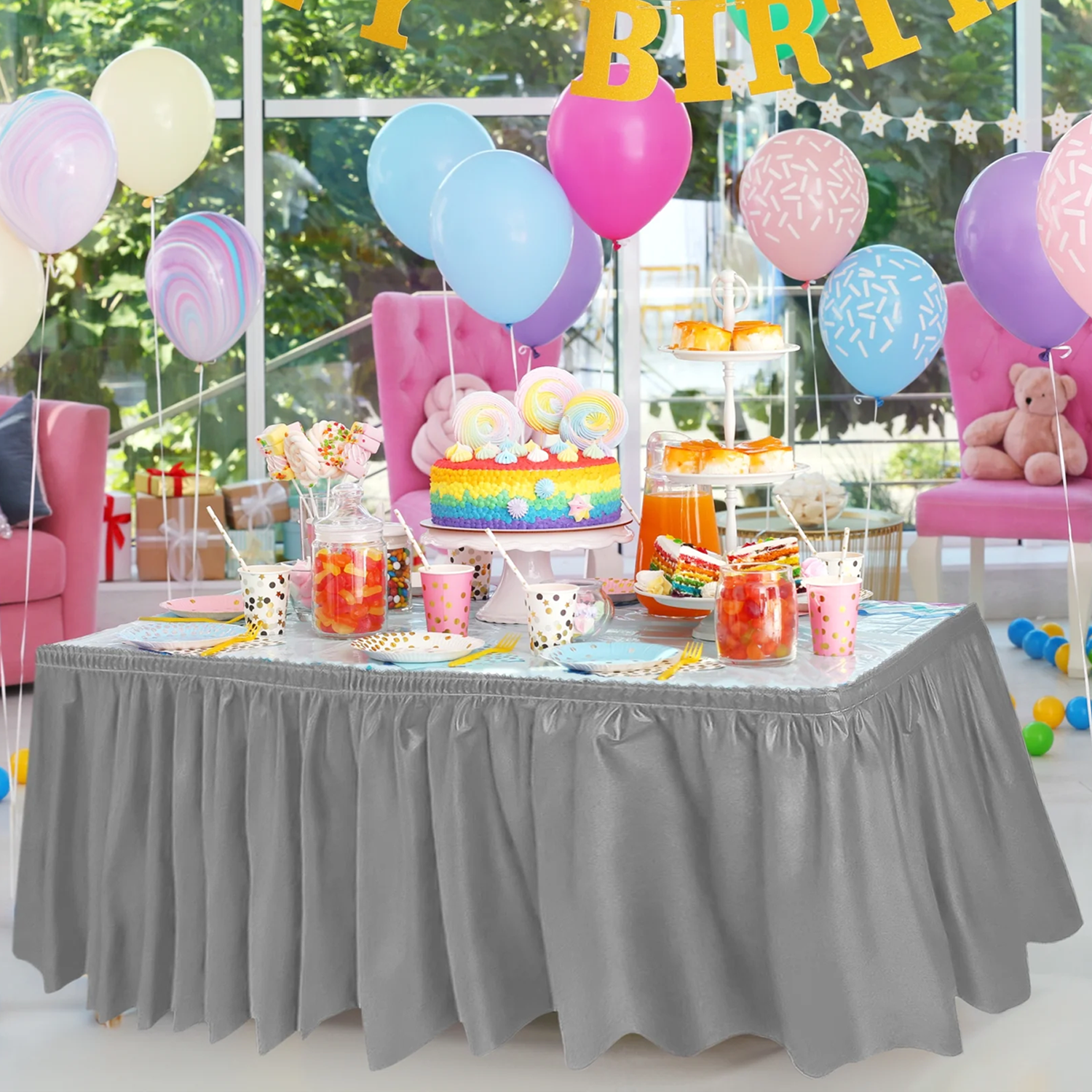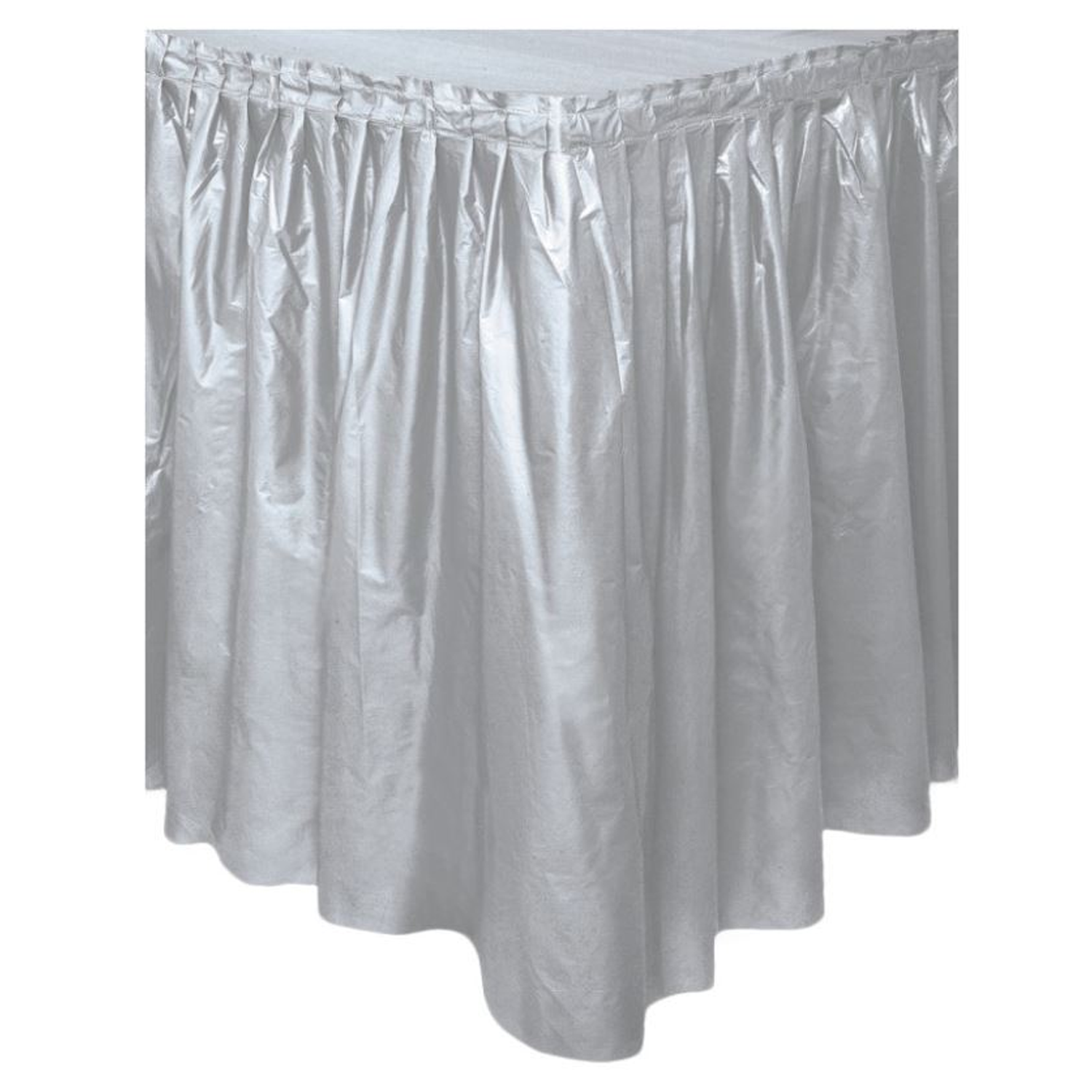 Add a sleek, reflective accent to any event with the Silver Solid Plastic Table Skirt, measuring 29″ high by 14 ft long. Crafted from heavy-gauge, waterproof plastic, this skirt drapes smoothly around standard banquet and folding tables to conceal legs and under-table storage. Its lustrous metallic silver finish catches the light for instant sparkle, while the built-in peel-and-stick adhesive backing makes installation quick and tool-free. Durable and reusable, it wipes clean easily and rolls flat for compact storage between celebrations. Table Skirts
